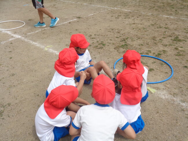 1年生の体育の時間には、フラフープを使った輪くぐりリレーを色別グループで行っていました。走るペアの組み方、走順、輪くぐりの作戦などをグループごとに話し合って、実際に競技。さらに結果から修正点を話し合っていました。後片付けもみんなで協力して行います。