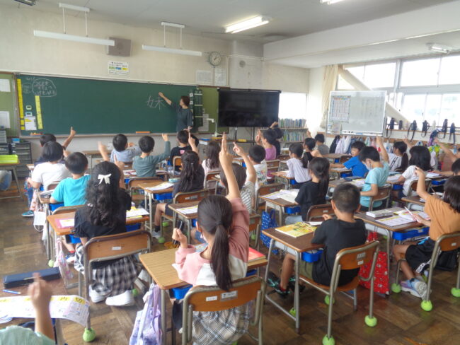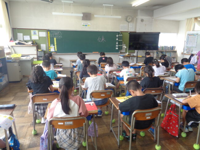 2年生の教室をのぞくと、国語の学習を新出漢字練習から始めていました。15画から20画と随分難しい漢字を新しく知り、どんな時に使うのかなと漢字ドリルの例文を読みます。どの子も一生懸命です。