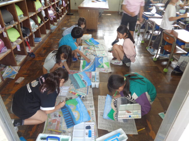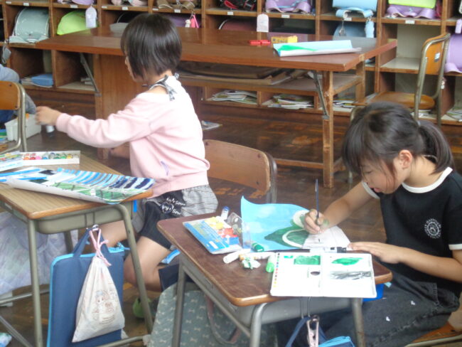 3年教室では、ふるさとを描いた写生画の仕上げにかかっていました。思い思いの色彩を丁寧に画用紙に表現しています。