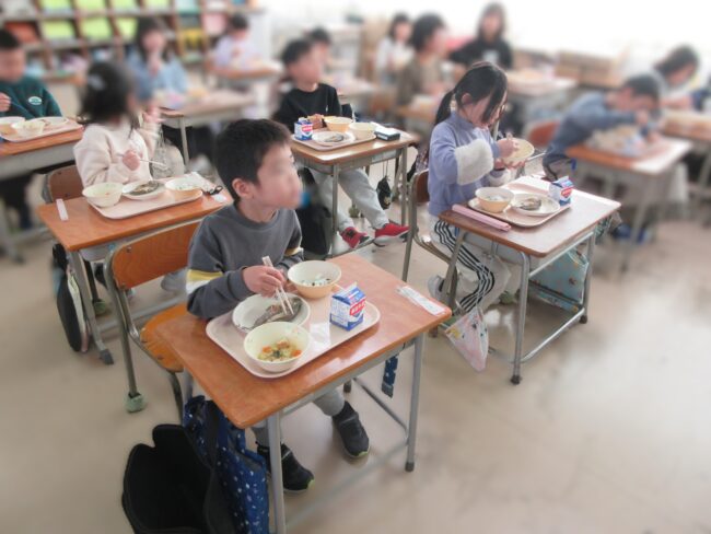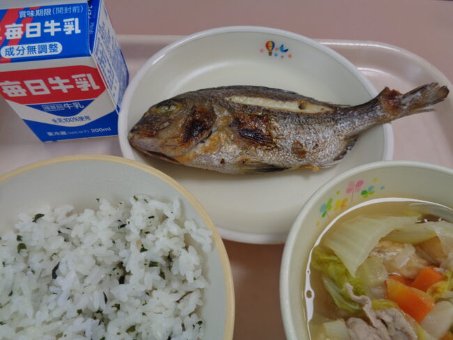 本日の給食は、真鯛給食。一人1匹ずつの塩焼き真鯛を箸をうまく使って、ペロリと(?)食べます。毎年提供される真鯛給食も、6年生は6回目。さすがに慣れた(?)箸使いでおいしそうに食べています。
