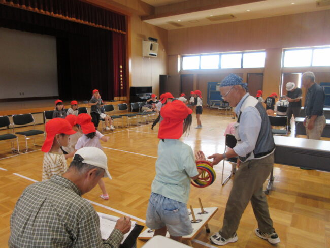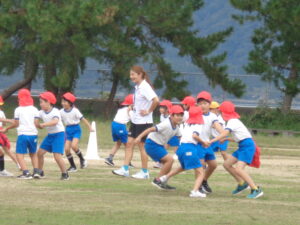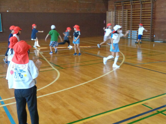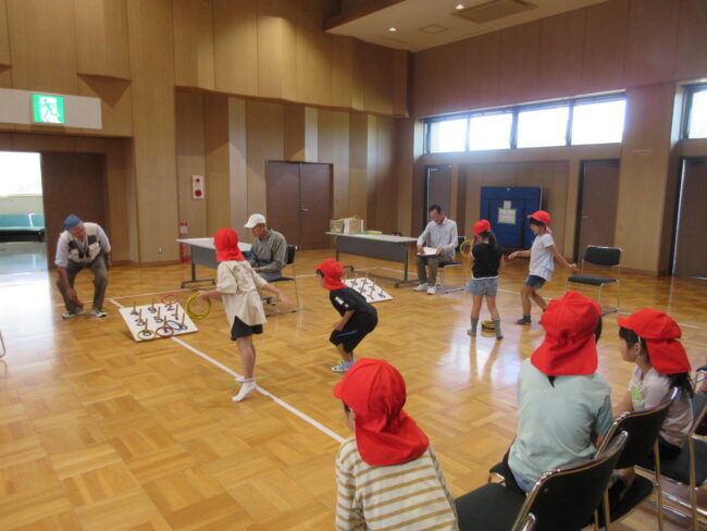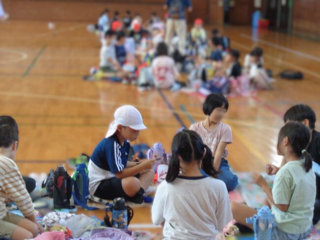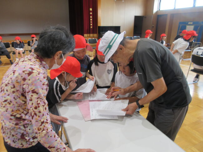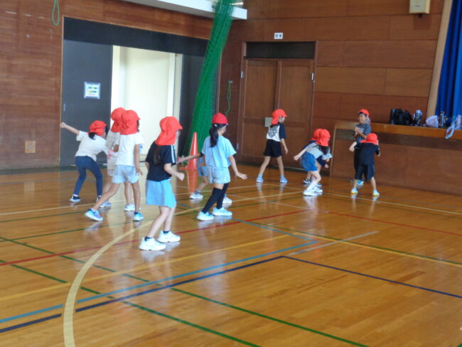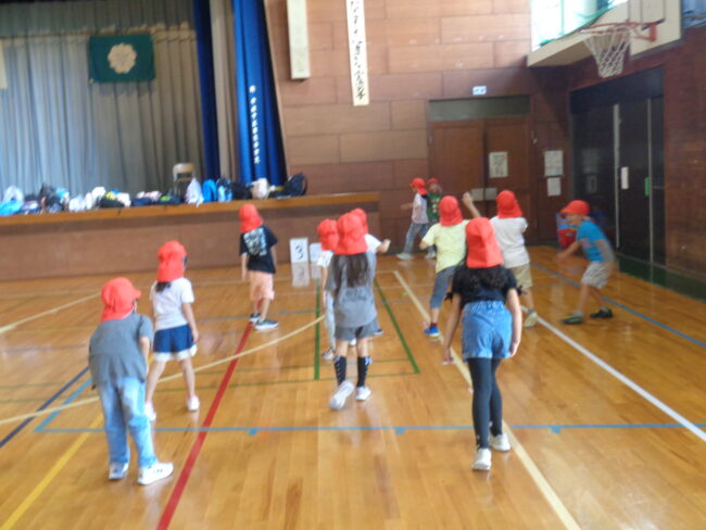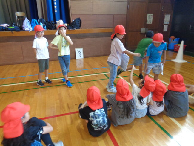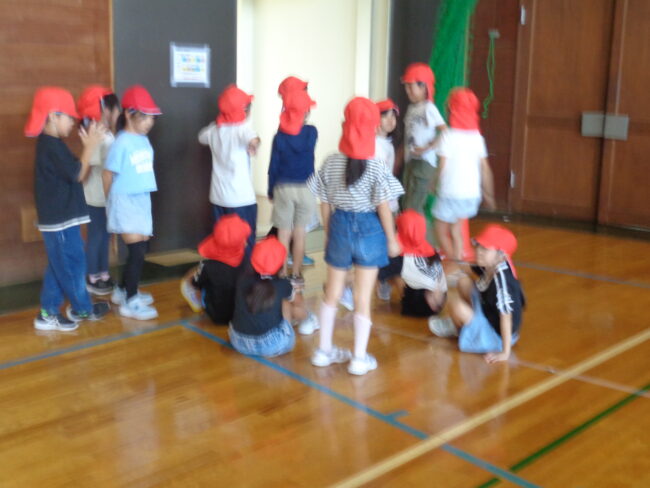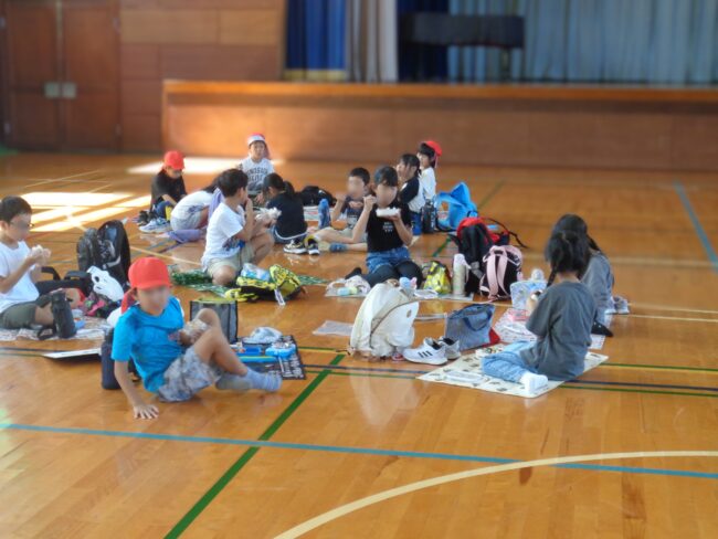 それぞれの見学が終わって、学校へ戻った1,2年生は縦割り班に分かれてお弁当タイム。公園で食べるはずだったお弁当ですが、給食とは違って体育館で楽しく食べました。その後は、2年生が企画準備した遊び縦割り色別班で楽しみました。2年生のお兄さんお姉さんぶりを発揮!
