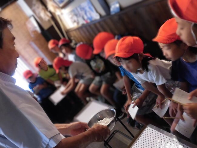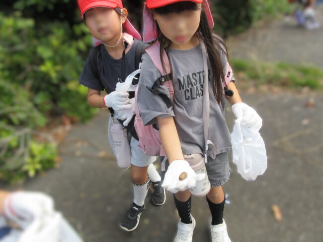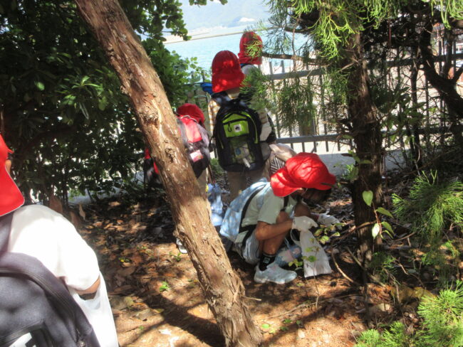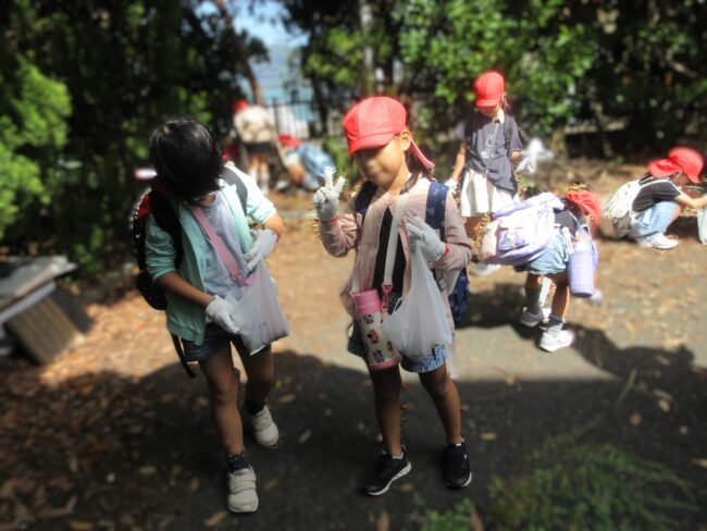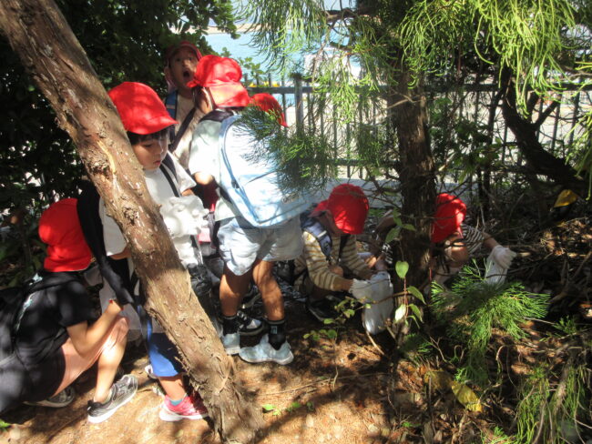 【1年生】小学校前の「雲浜コミュニティーセンター」の見学では、センター長さんのお話をきいたり、老人会のみなさんとゲームをしたりしました。そのあとは、小浜市浄化センターへ行き、センター敷地内で秋のどんぐりや松ぼっくりをたくさん拾いました。拾った”秋”で何を作るのかな。