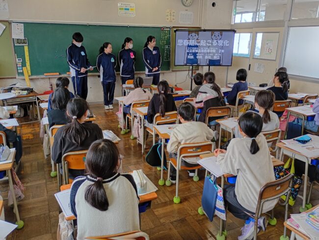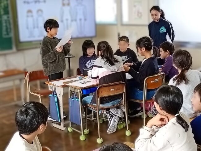 雪模様の1月21日5限目。 若狭高等看護学院から4名の生徒さんが来られ、「からだと心の成長」について4年生と一緒に授業をしました。学生さんらのスライドやワークシートを使って、体の外や中に表れる変化と心の変化について正しい知識を楽しく教えていただきました。初めて知ったこともあった4年生。「個人差があるから大丈夫」という言葉に安心した4年生でした。