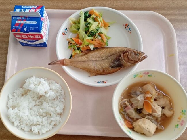 給食前にはカレイについての動画で事前学習をし、給食当番が丁寧に配膳をしました。「いただきます!」の挨拶でお箸で骨に気をつけながらおいしくいただきました。