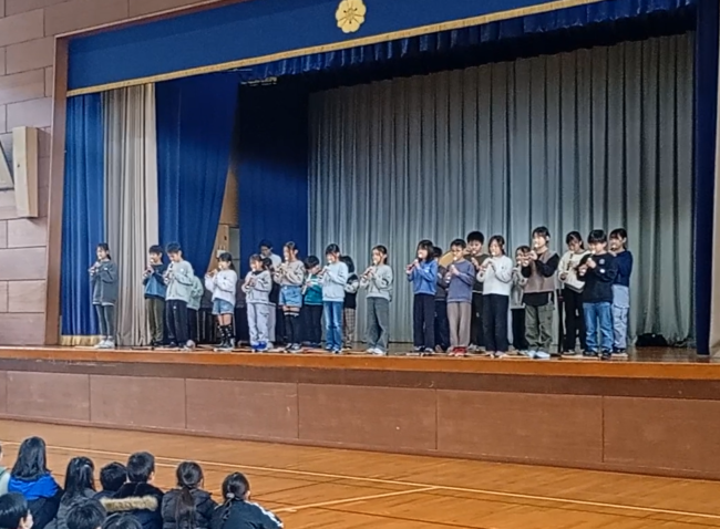 「ふるさと小浜」のこの地で活躍されている”消防署”や”スーパーマーケット”について学んだこと、地域の伝統として受け継がれてきているお祭りの笛・太鼓を聴いていただきました。特に笛や太鼓は、詳しい保護者の方にお世話になりご指導いただきました。一生懸命に練習してきた成果を発表すると同時に、笛の旋律、太鼓やかねのリズムは子供たちにしっかりと刻まれました。