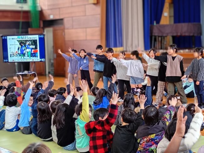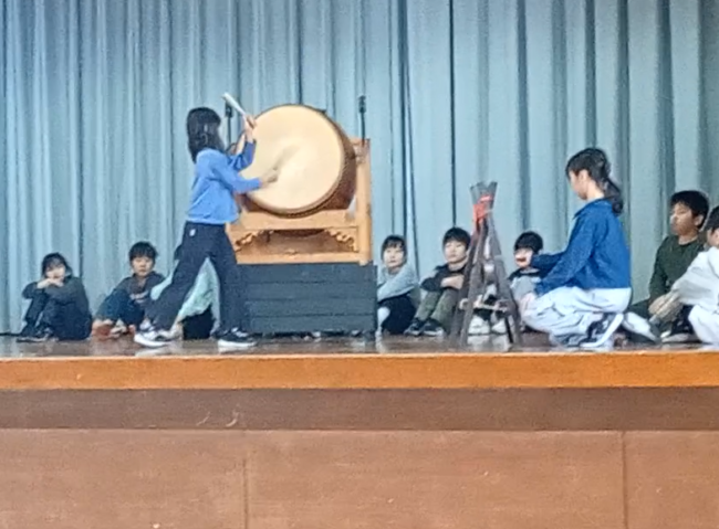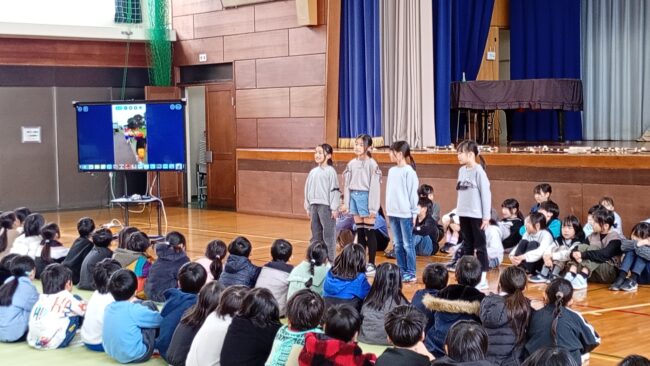 2月25日、本校体育館で保護者の方、お世話になった地域の方々、学校評議員の方、そして1,2年生に向けて、3年生が今年度の学びの総括をクイズやリコーダーと太鼓演奏を交えて発表しました。