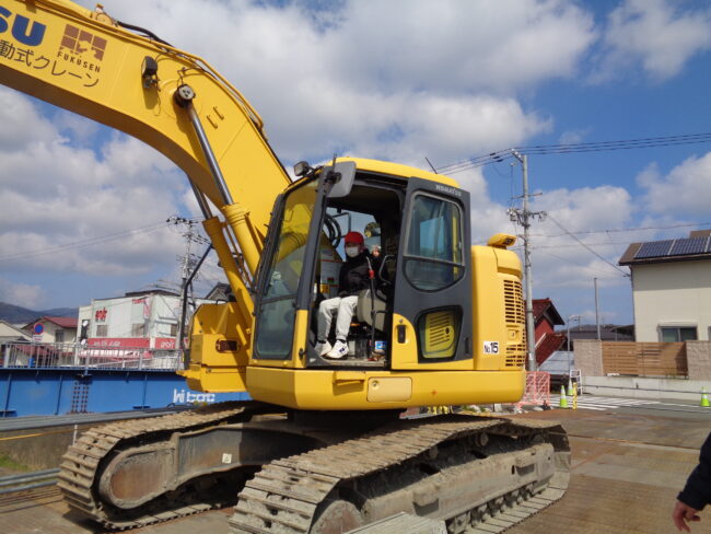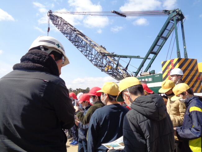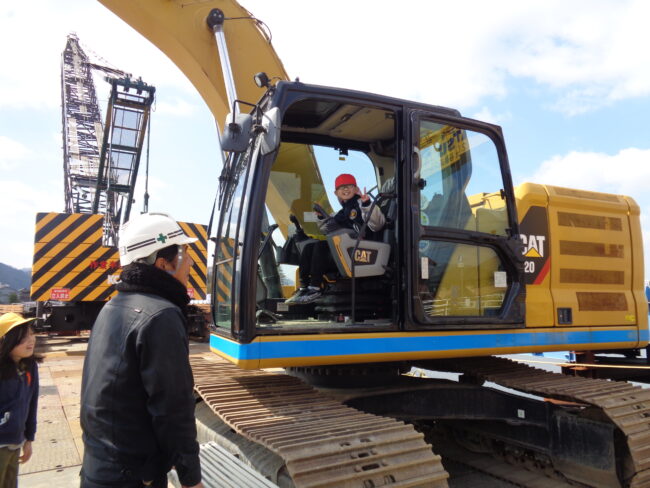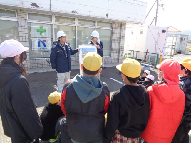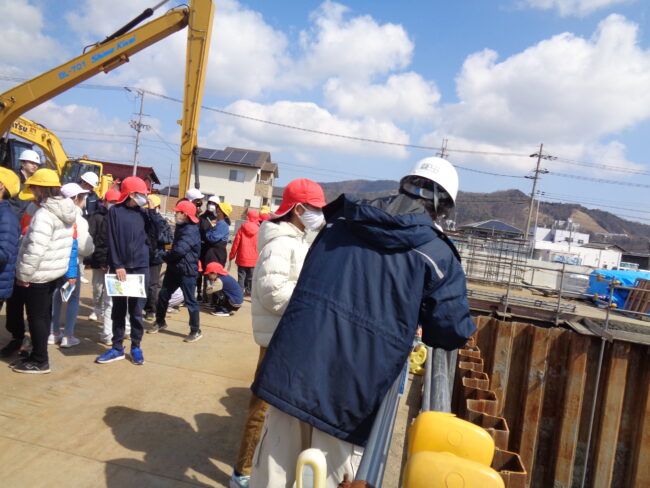 西津橋、大手橋の大規模な改修工事が進んでいます。このような工事は100年に一度だそうで、その瞬間に立ち会えているとも言えそうです。そのような中、17日に5年生が西津橋の工事現場見学をしました。県の担当者や現場で活躍されている業者の方に説明を受けたり、橋脚工事の様子を見せていただいたり、また、クレーン車に乗せてもいただいたりしました。
