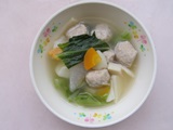 野菜スープには、タケノコの白、スナップエンドウの黄緑と淡い色でカラフルに仕上げてあります。