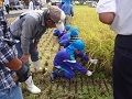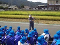 はじめに、ボランティアの代表の方より、稲刈りをするときの注意点についてのお話を聞いた後、全員が一列に並び稲狩りがスタートです。