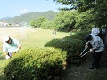 堤防下のツツジの周辺、校舎周り、プール周り、児童クラブ周辺の草刈りや木の剪定をしてくださり、大変きれいになりました。