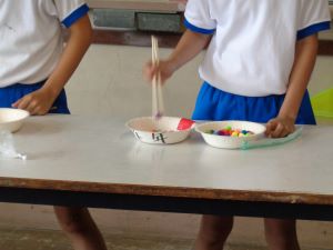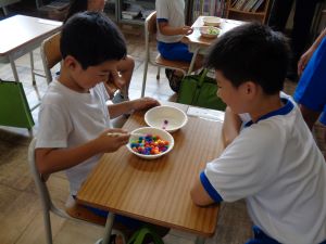 ポンポンを一つずつつまんで、隣の皿に移していきます。