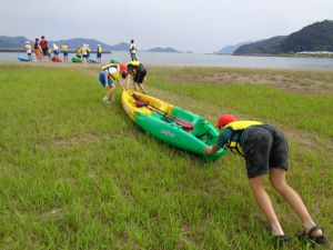 注意点を聞き、カヤックを自分たちで運ぶところからスタートです。