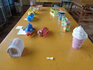夏休みに取り組んだ子どもたちの作品がならんでいます。