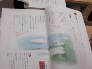 そして、まっさらな教科書に、ポイントとなることばや、繰り返し表現されている言葉、ふつうとは言葉の順序が違うところに線を引いたり、囲んだりして授業が進んでいきました。