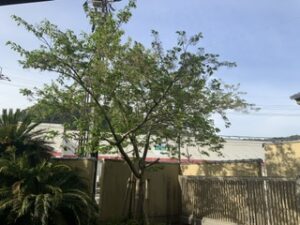 正門横の桜はすっかり葉桜に。