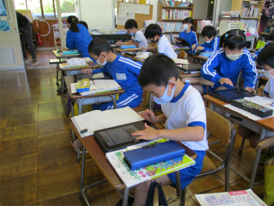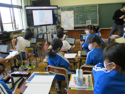 針葉樹の記号を見て、映像を見て、「あっ、こんな場所って学校の周りにもあるよね。」との声。内外海小学校の地図を見て気がついたことの一人調べをしていました。結構、クロムブックのことで分からないところを教え合っていることにびっくり!