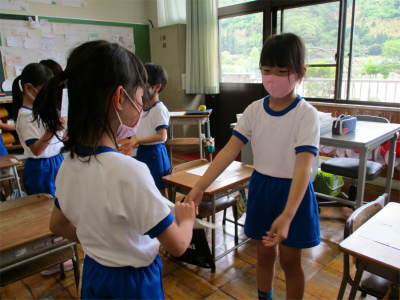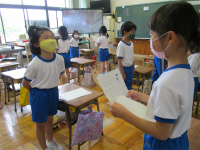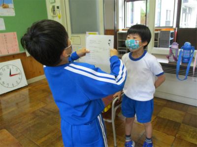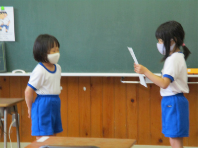また、休み明けから始まる「自己紹介」の練習もしました。まずは、学校にいる先生方に「自己紹介」をします。「おはようございます。(こんにちは)」「今、お時間よろしいでしょうか」に始まり、自分の名前や好きな物を伝えます。最初のあいさつの後の時間があるかを確かめる聞き方はとても難しいです。できるかな。