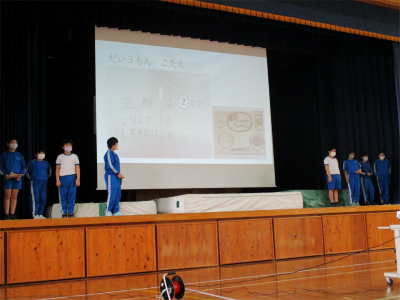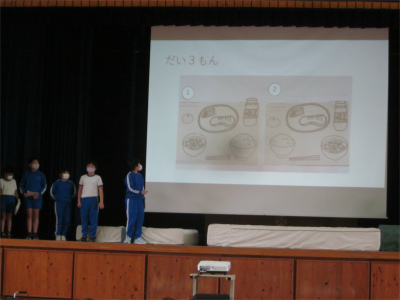 給食の食器の配置やマナーについて、クイズ形式での紹介がありました。
