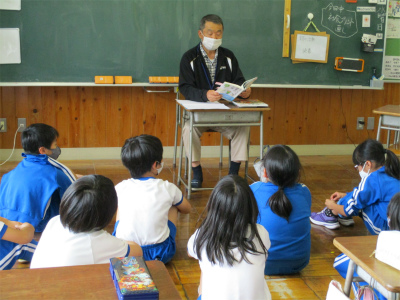 さて、今日は今年度初の「読み聞かせ」です。今年は1・2年生のグループ、3年生のグループ、4年生のグループ、5・6年生のグループの4つに分かれます。