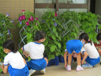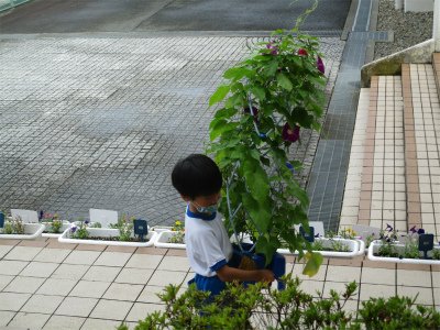 今年のアサガオはどの鉢もよく育っています。児童玄関にずらりと並んだアサガオ!なかなか見応えがあります。アサガオの鉢を移動させた後、1年生達は、砂場でお山作りをしていました。気がつくのが遅くて、山はなくなっておりました。もうすぐ小学生になって初めての夏休みです。1学期最後まで頑張る1年生です。