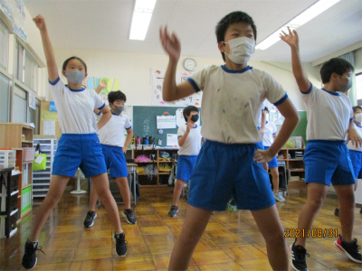 人数の多い学年なので、少し密になってしまいますが、2人のリーダーが前へ立って、一緒に真似をして踊ります。2回目のぞいた時は、ずいぶんかっこよくなっていました。