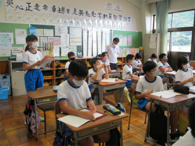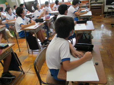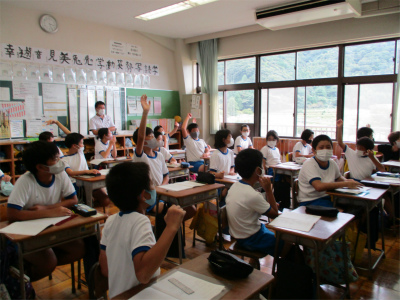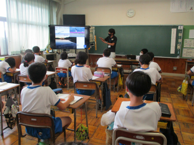 9月17日金曜日。本日の6時間目、嶺南振興局より職員の方が2名来られて、出前授業を行いました。そのうちお一人は、なんとこの内外海小学校の卒業生です。中学生のご兄弟がおり、「知ってる!」と子ども達。このように先輩に教えていただくということもめったにない機会です。