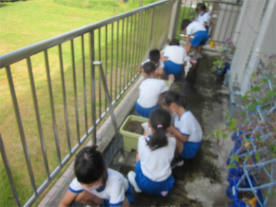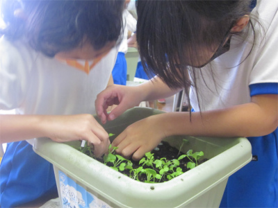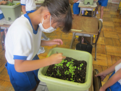 カブの種をまいてから2週間たった9月14日(火)に間引きをしました。「大きなカブ」になるように密集したところを抜いていきます。抜いた葉っぱは持ち帰って、お味噌汁にでも入れたのかな?