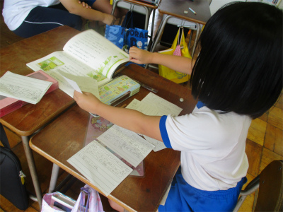 2年生は、国語科で「新入生体験入学」で披露する音読劇「お手紙」(国語科)の練習に熱心に取り組んでいます。自分の担当する箇所を書き抜き、そこをどのように読むのかメモを作っていました。