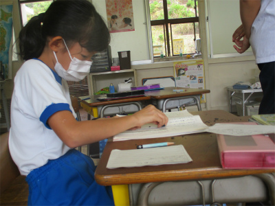 練習の途中で自分の机へ行って、シートの書き込みをしています。