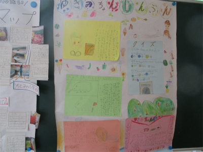 廊下には2年生の作った「ゆきみちゃん新聞」が貼ってあります。2年生のアイドル「ゆきみちゃん」教室で眠そうにしていました。