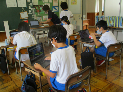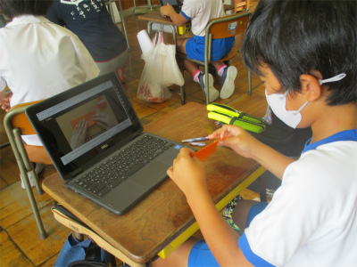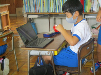 休み時間なのに、4年生は教室にいます。どうしてだろう?何気なくのぞくと、クロムブックを使っています。つい最近まで、「タイピング」がはやっていたのですが、この頃のはやりは「お絵かき」だそうです。また、ハロウィンパーティーでもするのでしょうか。折り紙で画像を見ながら景品を作っている子もいます。