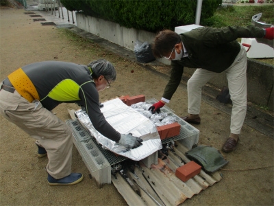 教頭先生!腰痛と闘いながら、1年2年生のために焼き芋マシーンを調整しています。強力な助っ人も登場です。