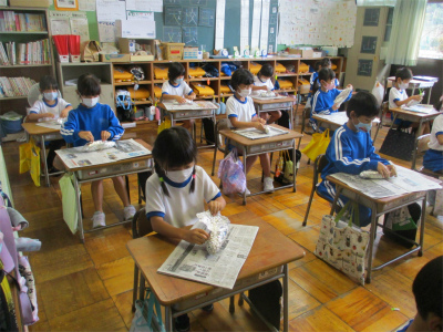 11月5日金曜日。本日、1年生2年生の掘ったサツマイモを使って「焼き芋祭り」開催です。昨年度も「絶品!」と好評だった教頭先生作、「焼き芋マシーン」を使って焼き芋を作りました。最初、焼き芋づくりの準備です。洗ったサツマイモを新聞紙とアルミ箔で丁寧に包みます。自分の芋の証明、「名前」を大きく書きます。