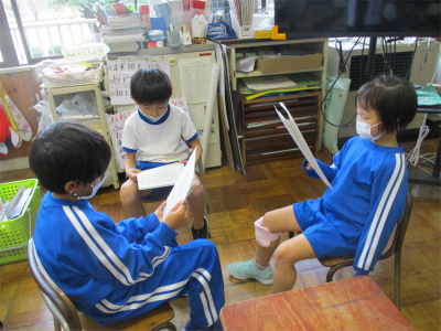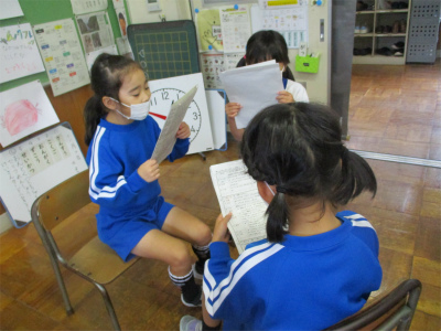 1年生への言葉や伝え方が分かりやすいかを確かめます。はっきりと聞き取りやすい声で発表できていて驚きました。