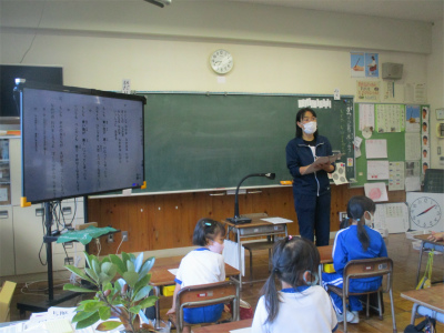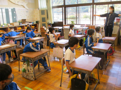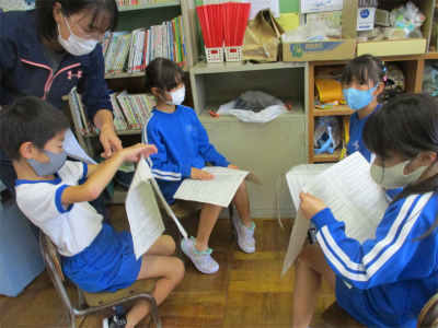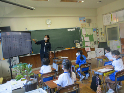 本日、1年教室の朝の会では、「学習発表会」で毎年歌っていた(昨年度はコロナの状況から歌はありませんでした。)「なかまはたから」という内外海小学校の愛唱歌を練習中でした。カモメやペンギン、クジラが出てくる夢いっぱいの素敵な曲です。現1年2年生が初めてです。この歌で学習発表会を盛り上げられたらいいですね。1年生は、新入生体験入学の練習もしています。発表の準備はもちろんのこと、学校案内のリハーサルも行っています。先輩として、かっこいいところを見せられるかな。
