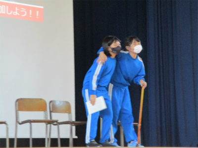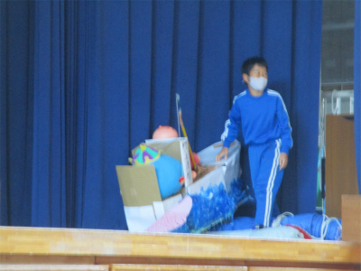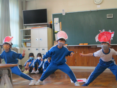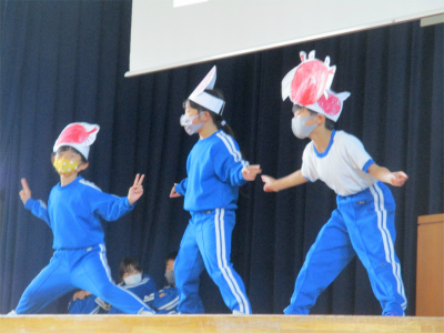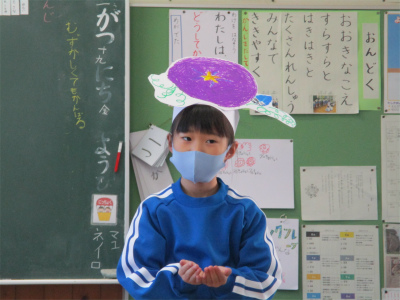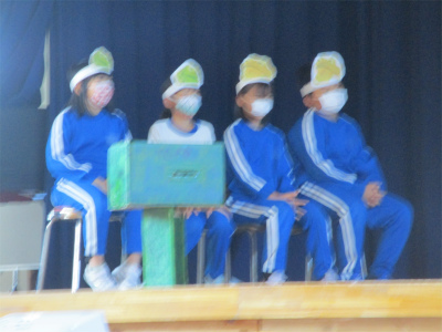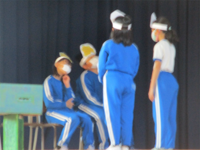 2年生は、新入生体験入学でも披露することになっている国語「お手紙」の音読劇を見せてくれます。小道具も自分達で工夫して作りました。