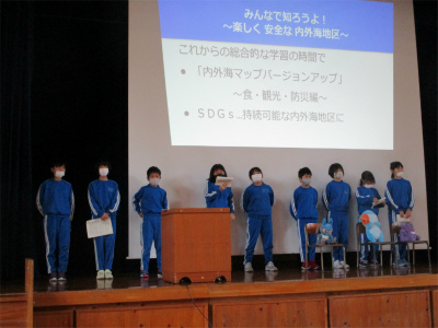 4年生の見せ方は、とても工夫されています。内外海の防災に関する調べ学習から考えたことや発見をパロディーを使って伝えてくれています。