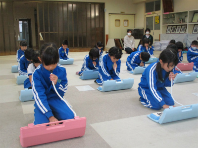 最初は、1年生と2年生で「内外海小学校校歌1番」を歌います。元気に立派に歌えました。続いて1年生の発表です。1年生は、ピアニカや楽器を使った演奏を披露しました。