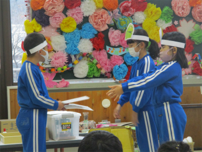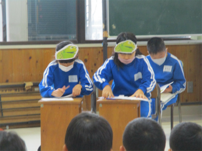 最後は、「きらきらぼし」を歌いました。続いて2年生。2年生は、先日の学習発表会で好評だった音読劇「お手紙」を披露しました。5人の息の合った音読でした。学習発表会よりも会場は狭かったけれど、大きな声で発表できました。