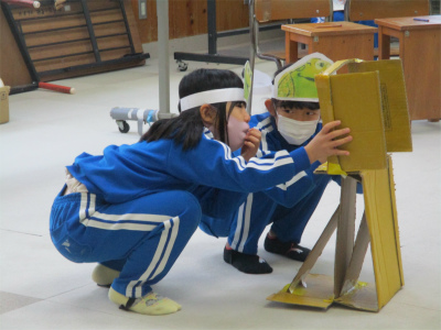 続いて、お楽しみの遊びコーナーです。1年生の秋の実を使ったお店や2年生の作った、動くおもちゃのお店がずらりと並びました。「さあ、いらっしゃい!」