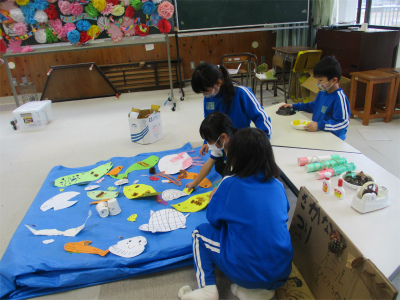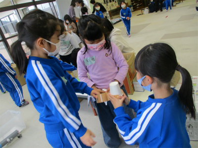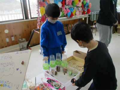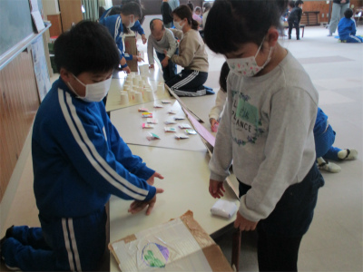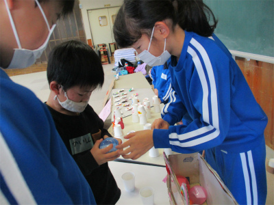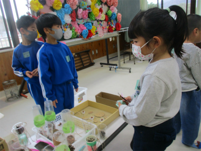 2年生の作った「ガチャガチャ」には、長蛇の列ができました。並んでいる友達に「こちらはすいているよ!」と誘いにきた1年生がいました。楽しい遊びコーナーでは、いろいろな景品があり、新入生の袋は一杯になっていました。