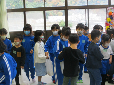 11月24日水曜日。本日、来年度小学校に入学のお友達が内外海小学校にやってきました。今日は、1年生と2年生でもてなします。まず、最初にお出迎えです。どうやら、担当が決まっているようです。1年生がしっかりとエスコートをします。