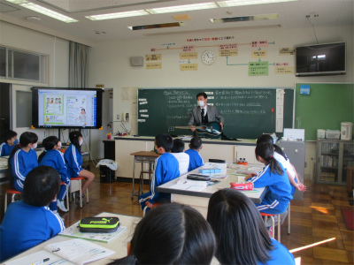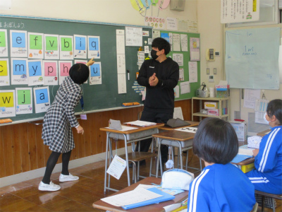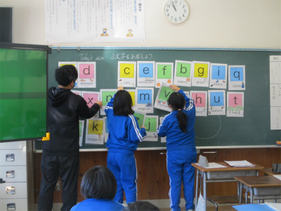 さて、4年生は、外国語支援員の先生が来られての授業でした。今日は、アルファベットの小文字の学習です。