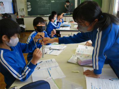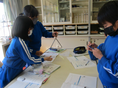 「チーンチーン」と涼やかなトライアングルの音が理科室から聞こえてきました。3年生が理科「音の伝わり方」の実験をしています。