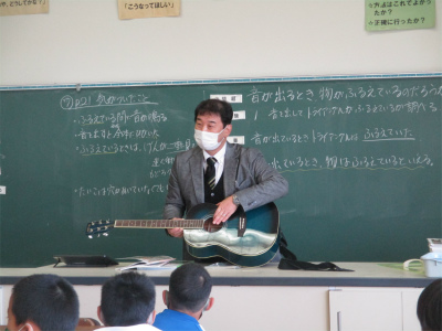 トライアングルの次は、「ギター」が登場!担当の先生が「大きな音」と「小さな音」を弾きました。(子ども達は目をつむって聴いています。)どのようにして音の大きさを違えているのか、予想します。次回に確かめの実験をします。