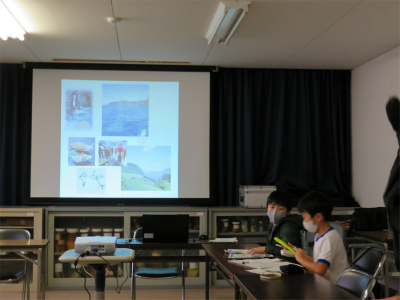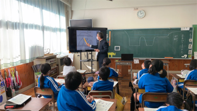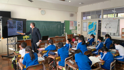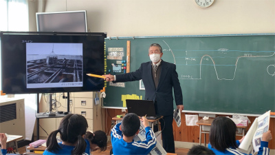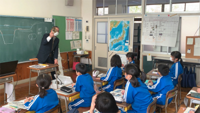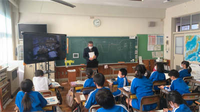 内外海小学校の話題は、少し前のこととなります。先週12月3日(金)、3年生は内外海地区で実際にカキの養殖に携わっている方にお話を聞きました。