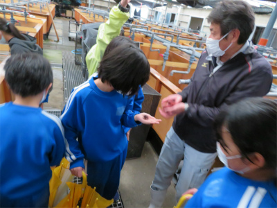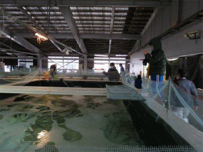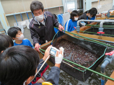 その後、栽培漁業センターへ。フグを見せてもらったり、ひらめにえさをやったりしました。寒くなる季節です。冬の魚たちの様子を観察しました。