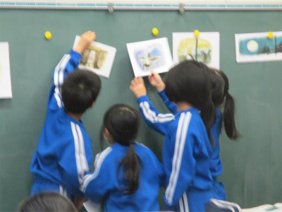 グループに分かれて、各場面のおもしろかったところや気になったところを話し合っています。場面を指さして説明したり、体を発言している友達の方に向けたり、上手に話し合っている様子に驚きました。