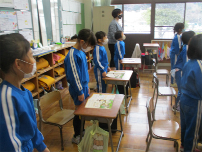 さて、4月8日に入学した1年生達。寒くても元気に登校し、学習にも前向きに取り組んでいます。今年の4月から新入生が入ってくるので、お兄さんお姉さんになります。そのような1年生達の授業の様子をお届けします。まず、昨日の国語の授業から・・・。「たぬきの糸車」というお話を勉強していました。