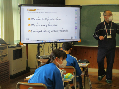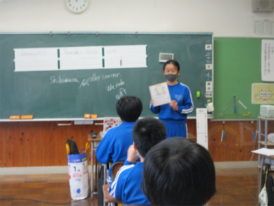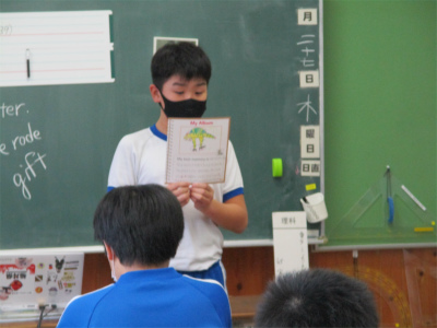 遠泳大会、修学旅行など、自分の心に残ったことを英語を使って伝えます。最後に、「スピーチを聞いてくれてありがとう。」と(もちろん英語で)伝えて終わります。堂々と、自分の描いたイラストを見せながら伝えていました。